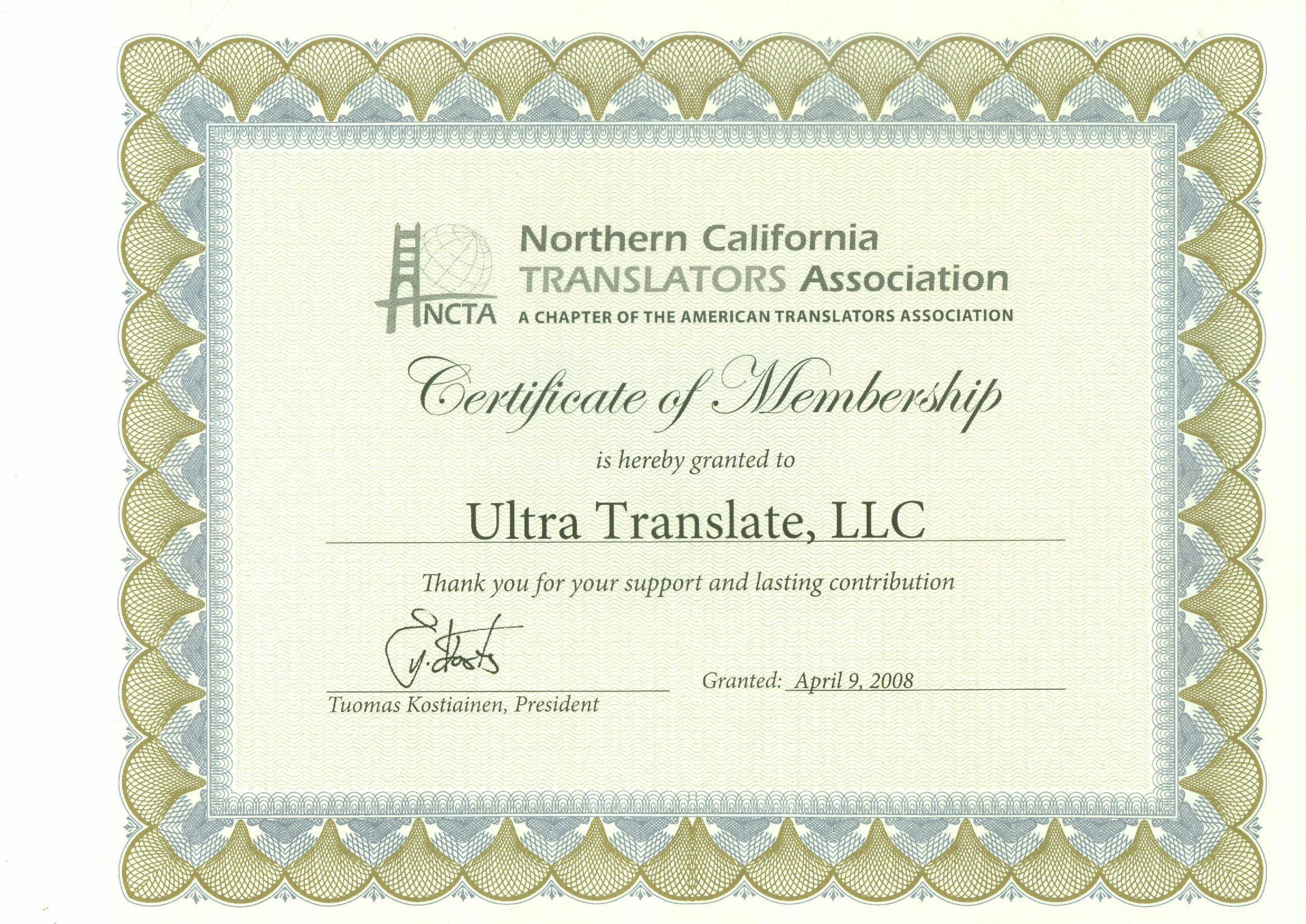A.T.A. (NCTA chapter) Membership Certificate (currently Valid)
